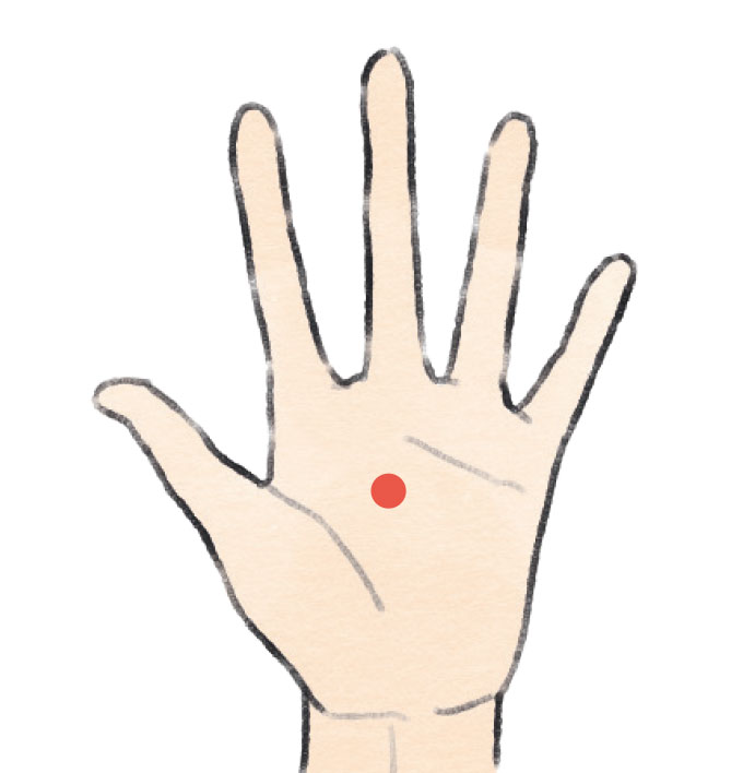 手を握って中指の先が当たるところにある「老宮」は、心を落ち着かせ、ストレスを緩和してくれるツボです。