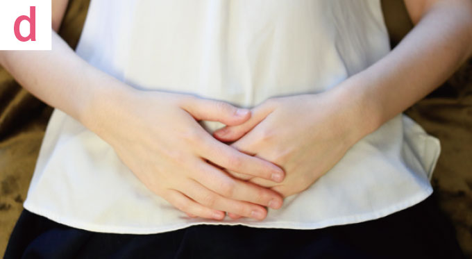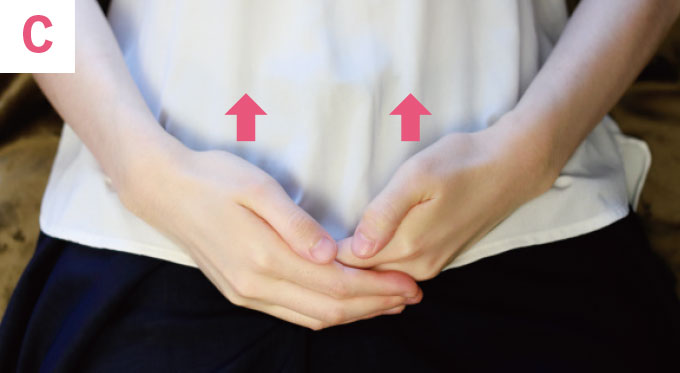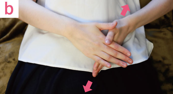 (上の女性の体イラストの)①のライン(鼠そ蹊けい部の骨よりもお腹側)に手を置き(写真b)、押しながら上下にゆっくりと10 回ほどマッサージ。②のラインも同様に行います。