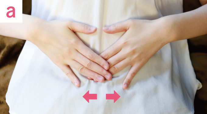 まずは小さな時計(小腸)から時計回りにほぐしていきます。小さな時計の6時の部分に手を置き(写真a)、ぐーっとひと押しし、左右にゆっくりと10 回動かします(※2)。その後、7 時、8 時……と同様に行います。小さな時計を一周したら、次は大きな時計(大腸)の6 時から時計回りにスタート。
