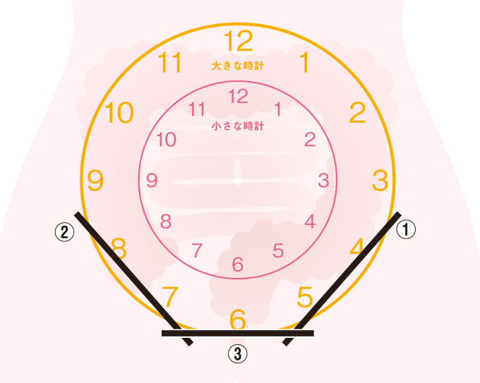 横になり、おへそを中心に小さな時計と大きな時計をイメージします(※1)。小さな時計はおへそから大体指の幅2本分、大きな時計は指5本分の位置になります。