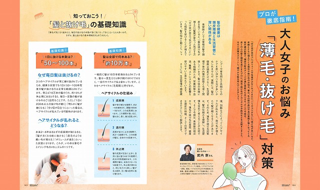 「分け目が目立つ」「ボリュームや毛量が少なくなってきた」「ハリやコシがない」「抜け毛が多い」など、年齢とともに増えてくる薄毛や抜け毛のお悩み。春は、冬の間の血行不良の蓄積と強くなってくる紫外線の影響で、頭皮や髪のダメージが進む季節でもあります。そこで今回は、多くの人の髪と頭皮を見てきたプロに、薄毛・抜け毛のメカニズムや予防法などをお聞きしました。今すぐ対策をスタートし、健やかな髪を育んでいきましょう。